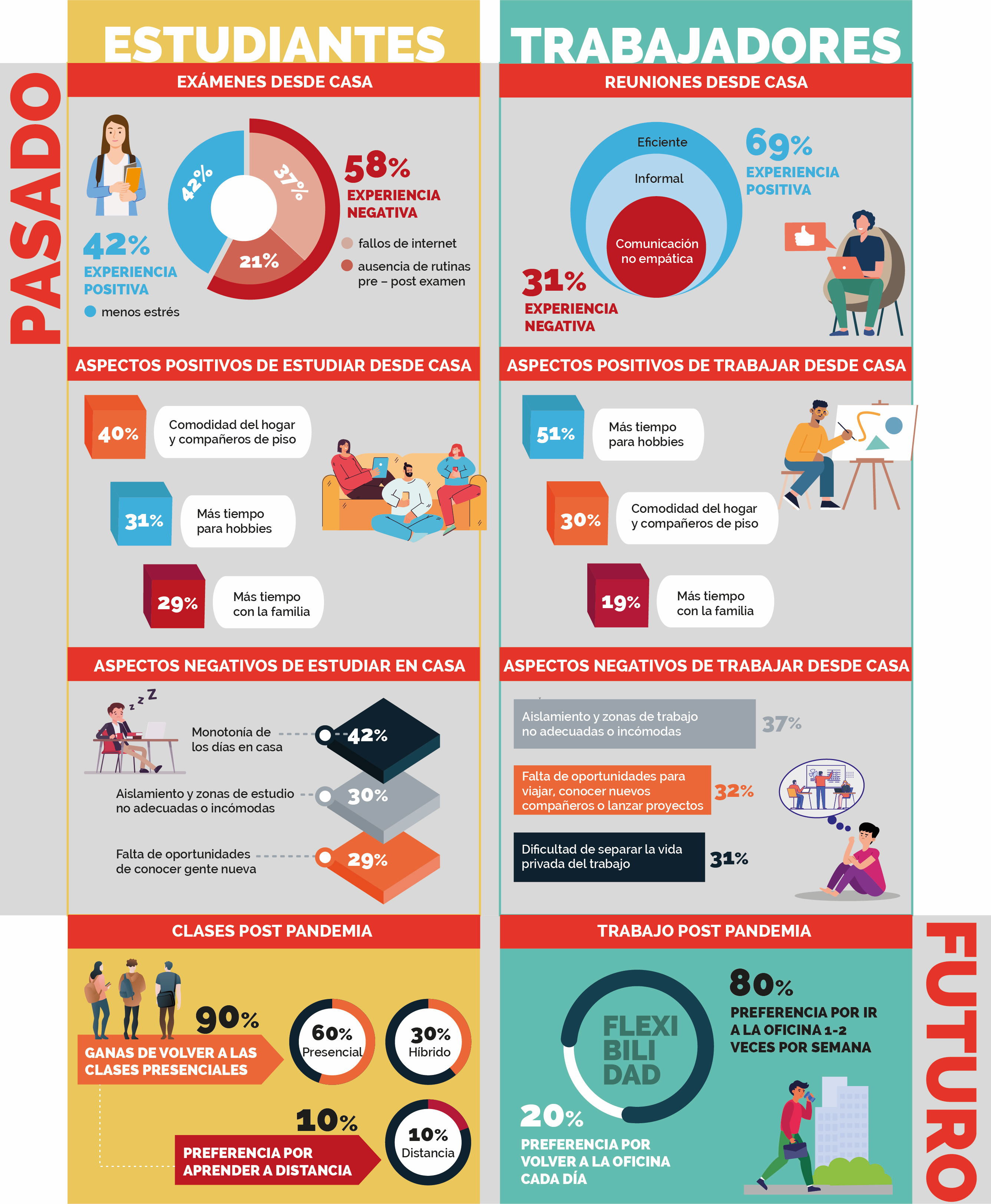 Seis estudiantes de cada diez declaran que preferirían volver a las clases presenciales, tanto porque la experiencia real no les resulta tan satisfactoria como la experiencia a distancia como porque la asistencia presencial les brinda más autonomía y la opción de vivir fuera del hogar familiar. Además, el 34% de los jóvenes encuestados declara que la flexibilidad debería ser la palabra clave para el futuro, rumbo a una modalidad de docencia «híbrida». Solo un estudiante de cada diez expresa una clara preferencia por las clases a distancia.