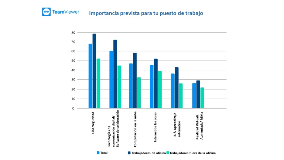 Según la encuesta, que recoge las opiniones de cerca de 3.160 trabajadores de oficina, 2.000 trabajadores sin escritorio fijo y 3.650 directivos de diez países europeos, los trabajadores de oficina calificaron la relevancia de las tecnologías futuras para su propia profesión de forma significativamente más alta que los trabajadores sin escritorio. Asimismo, cuando se preguntó a los trabajadores de oficina y a los que no lo son sobre la importancia que tendrían en sus trabajos tecnologías y megatendencias digitales. Los empleados de oficina ("desk workers") mostraron que tecnologías y las megatendencias digitales como la ciberseguridad (79%) y las tecnologías de comunicación digital/software de colaboración (71%), serían las más relevantes para ellos. En cambio, los trabajadores sitio fijo de trabajo (“deskless workers), los que trabajan en servicios de campo, logística o producción, por ejemplo, coincidieron en señalar tecnologías como la ciberseguridad (52%)y las tecnologías de comunicación digital/software de colaboración (45%), aunque con una ponderación diferente en cuanto a su importancia.
