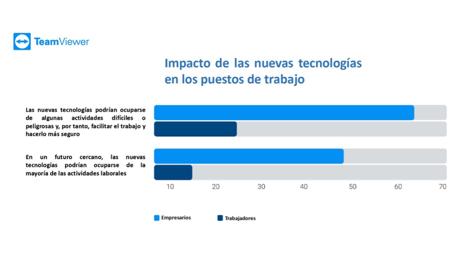 Según el estudio, sólo el 13% de los encuestados del lado de los trabajadores teme que las nuevas tecnologías se apoderen de su trabajo en el futuro. Sin embargo, más de una cuarta parte de los empleados (26%) espera que las tareas rutinarias tediosas o las actividades peligrosas les sean arrebatadas por las nuevas tecnologías en el futuro. Ante esta situación, los empresarios son aún más optimistas, alrededor de dos tercios de los estos (65%) esperan que sus empleados se vean liberados de esas tareas en el futuro.
