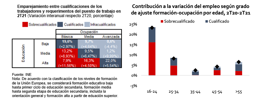 La incidencia de la sobrecualificación, más frecuente entre los trabajadores con formación alta en una ocupación media, es un fenómeno que decrece a lo largo de la vida laboral: en el 2T21 afectó al 49% de los menores de 24 años, pero solo al 27% de los mayores de 55.