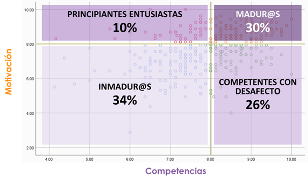 En el otro lado de la balanza, se encuentran los inmaduros, un 34% del total de la muestra. Destacan por estar poco motivados por temas sociales y medioambientales y también obtienen una peor puntuación en empatía, liderazgo y ejecución. El hombre representa el 67% de este grupo.