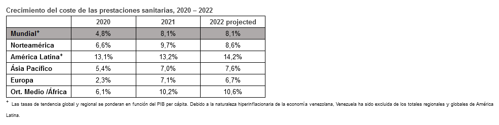 Bajo título Tendencias Médicas Globales 2022, la encuesta ha revelado también una considerable variación entre regiones geográficas. Con la aparición del COVID-19 en distintos momentos de 2020 y 2021, y con distinta intensidad en cada país, los resultados del análisis arrojan que el arco asimétrico de la pandemia creó una considerable volatilidad en la utilización y los costes de la asistencia sanitaria en todo el mundo.