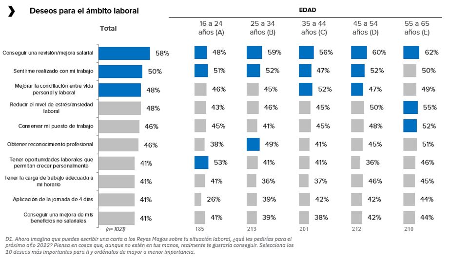 En este sentido, y de acuerdo con los datos recogidos, a casi 6 de cada 10 profesionales (58%) les gustaría conseguir una mejora salarial, sobre todo entre los de 45 años en adelante. A este deseo le seguirían sentirse realizado en el trabajo (50%), mejorar la conciliación entre la vida personal y laboral y reducir el nivel de estrés (ambos con un 48% de las menciones).