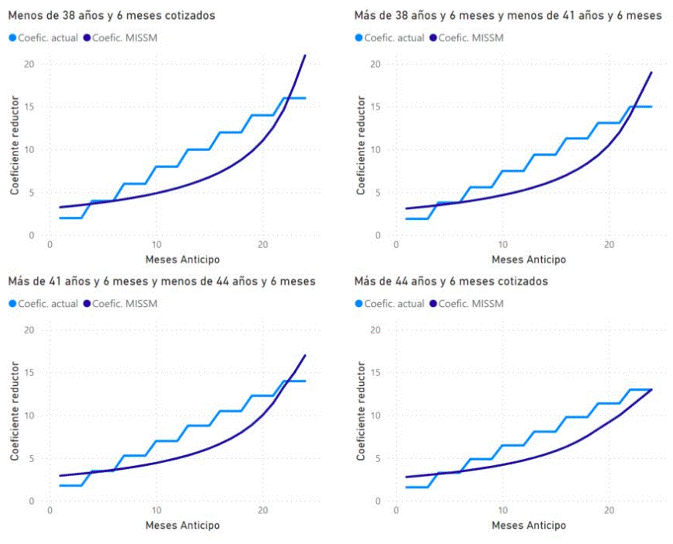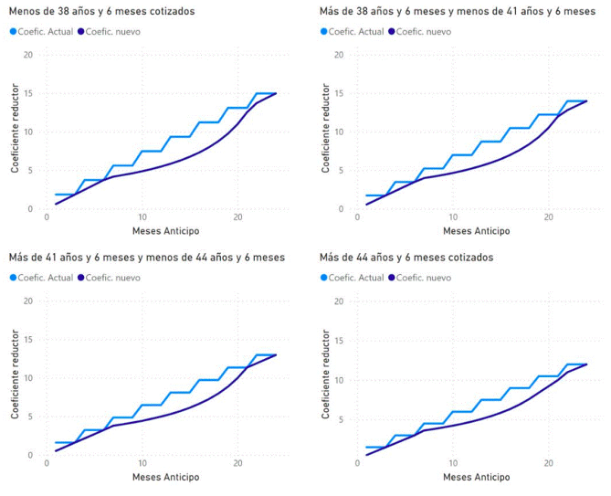 Gráficos comparativos de los coeficientes reductores para la jubilación anticipada voluntaria según años cotizados y meses de anticipo
