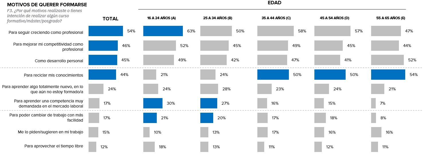 Por rango de edad, mientras los más jóvenes se forman para aprender competencias muy demandadas (30% de menciones frente al 17% de media) y para cambiar de trabajo con facilidad (21%); los profesionales de 35 años en adelante apuestan por formarse para reciclar sus conocimientos. En este punto, destacan especialmente los trabajadores de 55 a 65 años (54% de las menciones).