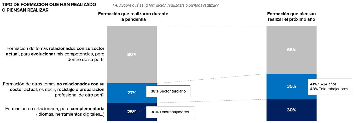Una de las principales conclusiones que se pueden extraer de la encuesta es la tendencia creciente a diversificar conocimientos, es decir, formarse en temas que no están directamente relacionados con el sector laboral del empleado. Y es que, aunque la gran mayoría de los que se formaron durante la pandemia lo hicieron para evolucionar sus competencias, 1 de cada 4 se formó en temas no relacionados con su sector laboral (27%) o en temas complementarios (25%). Asimismo, el 35% de los encuestados tiene previsto formarse este año en temas no relacionados con su sector laboral, y un 30% en temas complementarios.