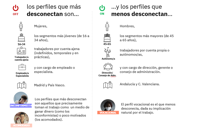 Por otro lado, el perfil del profesional que más consigue desconectar es mayoritariamente mujer, joven (de 16 a 34 años), que trabaja por cuenta ajena (indefinidas, temporales y en prácticas) y con cargo de empleada o especialista