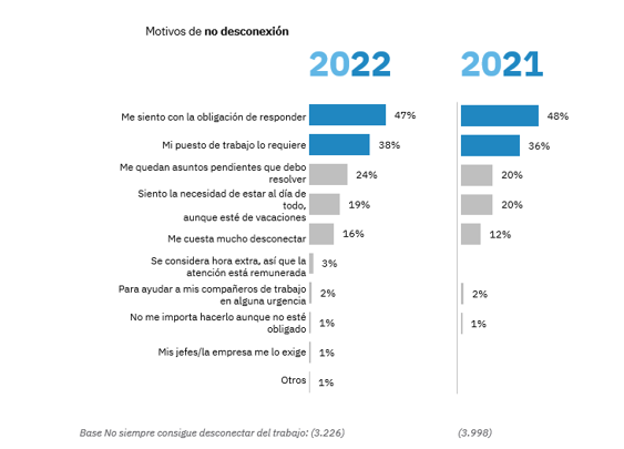 Sentir la obligación de responder llamadas telefónicas, mensajes o correos electrónicos fuera del horario laboral sigue siendo el motivo principal de no desconexión para los españoles, pues casi la mitad de los trabajadores –un 47%– alegan esta causa como justificante de no desconexión. Le siguen la exigencia del puesto de trabajo (38%) y los asuntos pendientes de resolver (24%). Los motivos de desconexión no han sufrido grandes variaciones respecto al año pasado, salvo por la mayor percepción de asuntos pendientes y el esfuerzo que conlleva desconectar, que han aumentado 4 puntos porcentuales respecto a 2021.