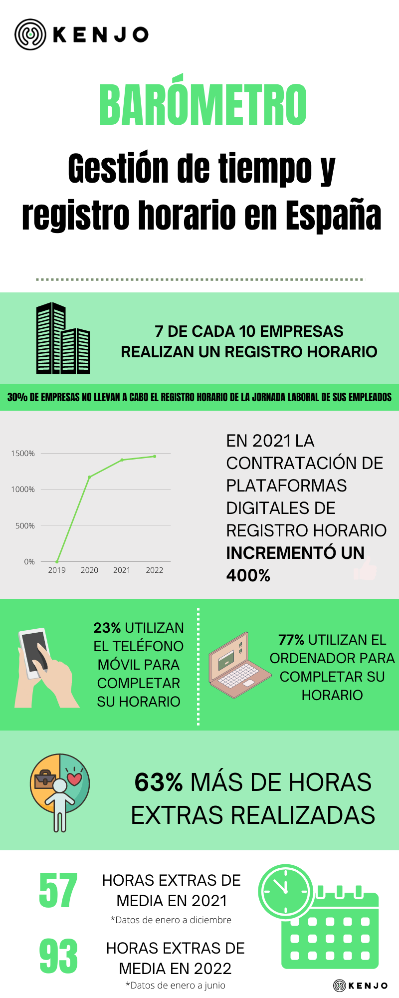 3 de cada 10 compañías en España no han instaurado un sistema de registro horario, según reflejan los datos de la Radiografía de Registro Horario en España que Kenjo ha realizado para conocer la situación actual en España y su nivel de adaptación al R.D ley 8/2019 de Control Horario.