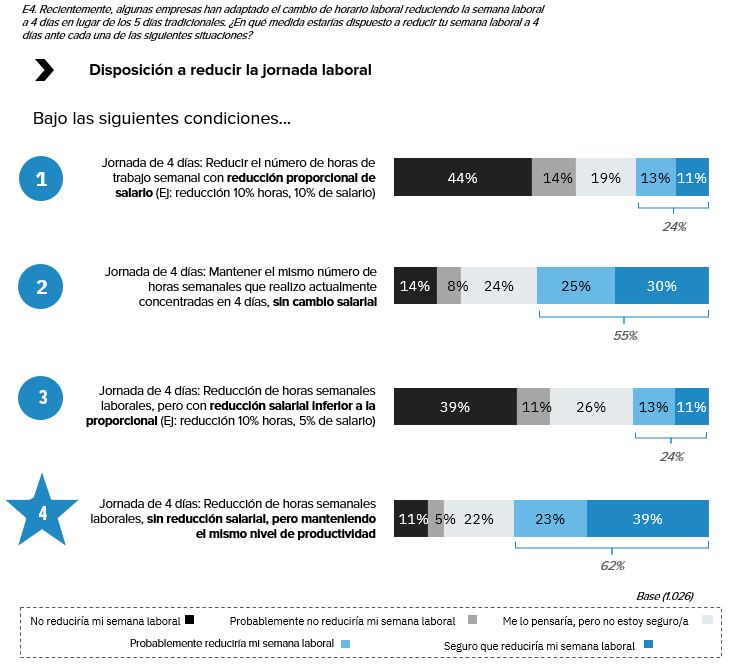 Según la encuesta sobre Jornada Laboral de 4 días realizada por InfoJobs, plataforma de empleo líder en España, el 62% de las personas trabajadoras se acogería a una reducción de su jornada laboral a 4 días, sin pérdida de sueldo, pero manteniendo el mismo nivel de productividad. Además, un 22% se lo plantearía, aunque le genera dudas; y alrededor de un 40% rechaza tajantemente reducir las horas semanales laborales si eso conlleva una reducción de salario, ya sea proporcional a la reducción de número de horas o no