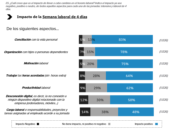 A la hora de ser consultados sobre qué aspectos recibirían un impacto más positivo como consecuencia de la implementación de este modelo laboral, el 83% de los encuestados considera que la jornada laboral de 4 días tendría un mayor impacto en la conciliación con la vida personal. A continuación, se mencionan: la mejor organización con hijos o personas dependientes (78%), el incremento de la motivación (75%) y el poder trabajar las horas acordadas por contrato sin horas extras (64%). Por el contrario, el aumento de la carga laboral y una menor desconexión digital son las derivadas que podrían considerarse poco beneficiosas, con un 14% y un 12% de las menciones, respectivamente.