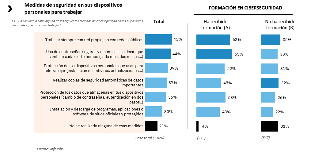 De acuerdo con el último Informe de InfoJobs sobre Ciberseguridad, solo el 38% de los empleados ha recibido algún tipo de formación o información acerca de la ciberseguridad por parte de su empresa. Y los que teletrabajan son quienes la han recibido en mayor medida (57% de las menciones, frente al 33% de los que trabajan de forma presencial). Los resultados también demuestran que tener formación en ciberseguridad ayuda a tomar más medidas de seguridad en los dispositivos personales del trabajo: el 4% declara no llevar a cabo ninguna medida, cifra que llega al 31% entre quienes no han recibido formación.