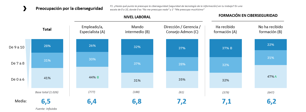 Por otra parte, cuanto mayor es el nivel laboral del empleado, más aumentan las preocupaciones. Entre los puestos de dirección, casi 4 de cada 10 profesionales manifiestan tener una gran preocupación, frente al 32% de los mandos intermedios y el 26% de los especialistas. La preocupación por la ciberseguridad está muy relacionada con el hecho de recibir formación, que supone casi un punto de diferencia en la media.