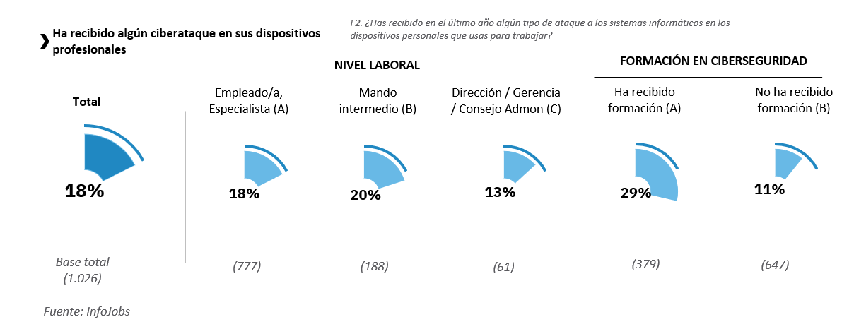 Respecto a la edad, los trabajadores de entre 45 y 54 años son los que en mayor proporción afirman haber sufrido un ciberataque (22%), mientras que los perfiles entre 35 y 44 años son los que menos (13%). Finalmente, los puestos de mandos intermedios comentan haber recibido un ataque informático en sus dispositivos personales en un 20% durante los últimos doce meses, frente al 13% de los puestos de dirección y el 18% de los empleados y/o especialistas.