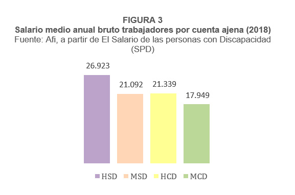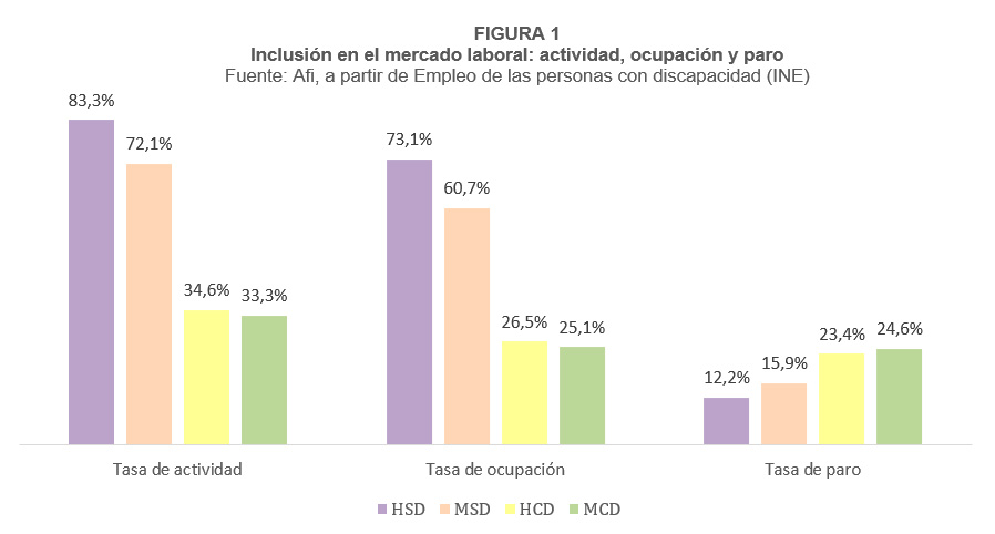 Del estudio y comparación de las tasas de actividad y ocupación2 se observa como las personas con discapacidad (HCD, MCD) presentan una menor participación en el mercado laboral, independientemente del sexo, y por ello, también presentan menores tasas de ocupación que las personas sin discapacidad (HSD, MSD). Estos datos sugieren que la brecha en las tasas de actividad y ocupación depende más de la condición de discapacidad que de la condición de mujer. De hecho, las brechas de género en las personas con discapacidad son apenas imperceptibles (de 1,3 puntos porcentuales (p.p.) en la tasa de actividad y de 1,4 p.p. en la tasa de ocupación, que se comparan con los 11,1p.p. en la tasa de actividad entre hombres y mujeres sin discapacidad y los 12,4 p.p. en la tasa de ocupación).