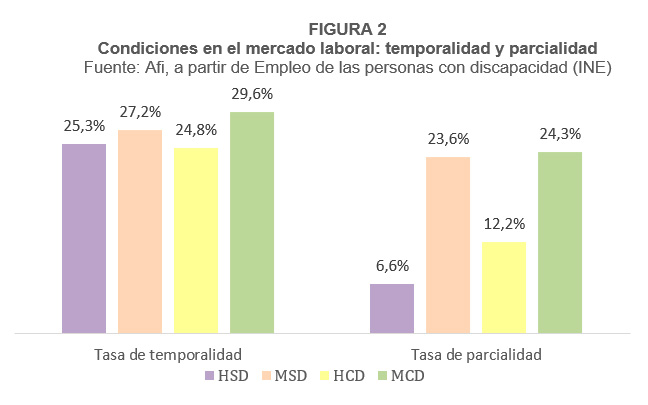 Una vez dentro del mercado laboral, el informe de ClosinGap analiza las condiciones laborales de las personas ocupadas según la duración del contrato (indefinido o temporal) y la jornada laboral del mismo (completa o parcial). En este caso se observa que las mujeres en ambos colectivos cuentan con más frecuencia con contratos menos estables y se puede afirmar que las desigualdades vienen explicadas por el género, siendo las mujeres con discapacidad las que presentan una tasa de temporalidad3 y parcialidad4 más intensas (29,6% y 24,3%, respectivamente).