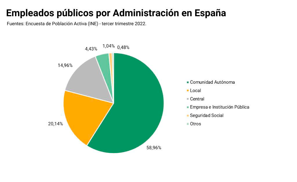 Según se desprende de los datos de la EPA, el Empleo Público en España tiene un marcado carácter descentralizado; de hecho, el 58,96% de los empleados públicos prestan sus servicios en las Comunidades Autónomas, y el 20,14% lo hacen en la Administración Local, mientras que solo el 14,96% de los empleados públicos trabajan en organismos de ámbito estatal.