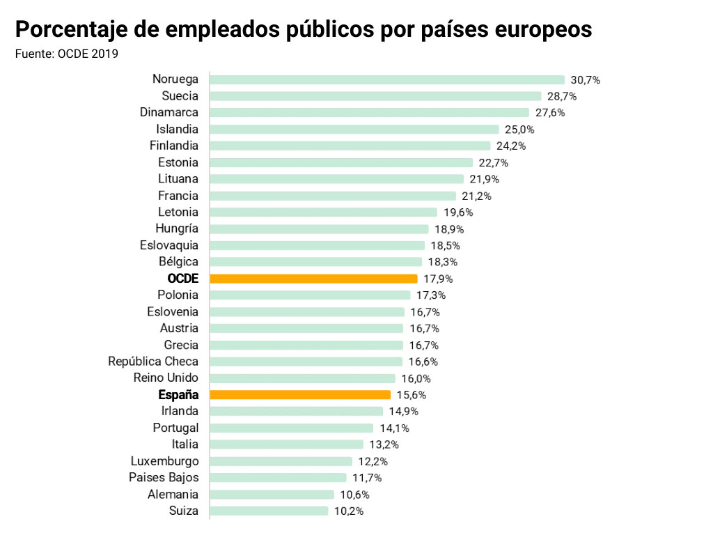 Según el informe de la Organización para la Cooperación y el Desarrollo Económicos (OCDE) “Government at a Glance 2021” sobre gobernanza pública, en 2019 el 17,9% de los trabajadores de los países de la OCDE desempeñaban su trabajo en las Administraciones Públicas. En el caso de España, este porcentaje era de un 15,6%, más de dos puntos inferior a la media, por debajo de países como Reino Unido (16%), República Checa (16,6%), Grecia (16,7%), Austria (16,7%), y ligeramente por encima de Irlanda (14,9%), Portugal (14,1%) e Italia (13,2%). Los mayores porcentajes de empleados públicos se situaban en los países nórdicos: Noruega (30,7%), Suecia (28,7%) y Dinamarca (27,6%), y cerraban la tabla, Alemania (10,6%) y Suiza (10,2%).