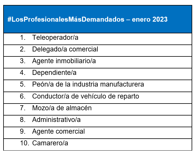 En el mes de enero, las tres primeras posiciones del ranking de los puestos más demandados las ocupan teleoperador/a, con 22.027 puestos de trabajo ofertados; delegado/a comercial, con 11.805, y agente inmobiliario/a (9.436). Precisamente, delegado/a comercial, debido al ya mencionado crecimiento de la actividad comercial, recoge 3.000 vacantes más que el mes pasado.