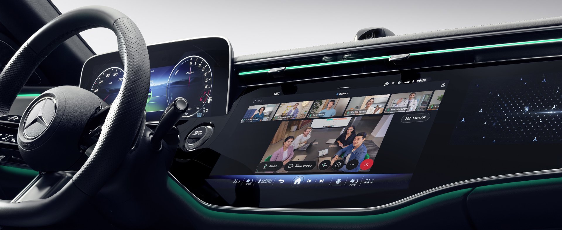 El interior del Mercedes-Benz Clase E 2023 se presentó en primicia el 22 de febrero de 2023. El nuevo vehículo estará equipado con conexión Wi-Fi y de datos móviles, entre otras muchas funcionalidades. Utilizando cualquiera de las dos conexiones, los conductores podrán descargar la aplicación Webex App de la Mercedes Benz Car App Store para que aparezca directamente en la pantalla táctil del sistema de info-entretenimiento del vehículo, eliminando la dependencia del teléfono.