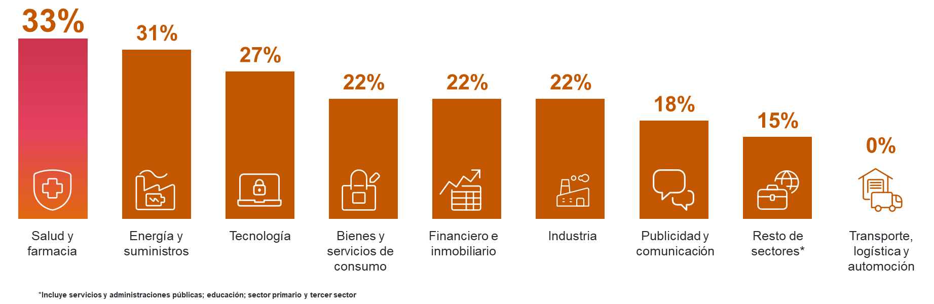 Tras Salud y farma se sitúa el sector energético, con un 31% de estimación de empleo. En tercera posición Tecnología (27%). A continuación, con un 22%, la industria de Bienes y servicios de consumo (que engloba el sector turístico); Financiero e inmobiliario; y el Industrial. Este último es el segundo que más crece, con una subida de 17 puntos respecto al trimestre anterior.