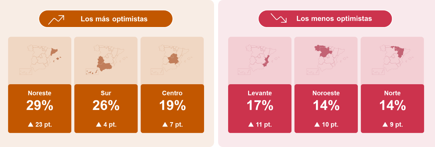 Las zonas Norte (Aragón, Cantabria, La Rioja, Navarra y País Vasco) y Noroeste (Galicia, Asturias y Castilla y León) son las más prudentes en sus estimaciones, con un 14% de proyección neta, aunque presentan un crecimiento intertrimestral de 9 puntos.