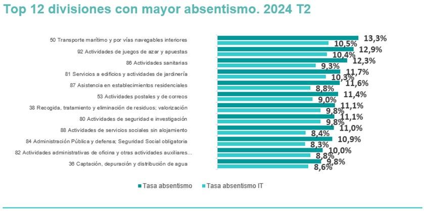 Focalizándonos en divisiones de actividad concretas, se puede establecer un top 12 con las que tienen un mayor y menor nivel de absentismo. La tasa de absentismo más alta es para “Transporte marítimo y por vías navegables”, con un 13,3%. Le siguen “Actividades de juegos de azar y apuestas” (12,9%) y “Actividades sanitarias” (12,3%). Por el contrario, “Edición” es la que cuenta con la menor tasa de absentismo con un 3,7%, así como “Actividades inmobiliarias”, también con un 3,7% y “Actividades relacionadas con el empleo” con un 3,9%.