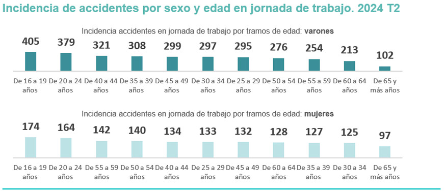 La incidencia de accidentes más alta en jornada de trabajo es para los más jóvenes (16-19 años) tanto en el caso de los varones con 405 (-6% interanual) como en el de las mujeres con 174 (+6% interanual).