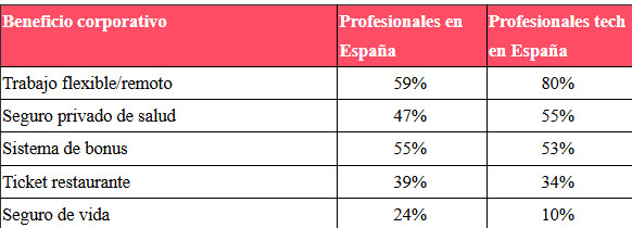 El estudio también recoge cuáles son los beneficios corporativos más valorados por los perfiles tecnológicos vs todo tipo de perfil y sector en España: