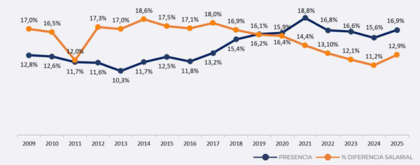 Actualmente, la retribución media de un directivo es de 95.541 euros brutos anuales, mientras que las directivas alcanzan los 84.647 euros brutos anuales, un 12,9% de diferencia entre ambos perfiles, lo que implica un aumento de la brecha del 1,7% respecto al 2024. Este dato muestra un cambio de tendencia, ya que desde el año 2017 la brecha había disminuido.
