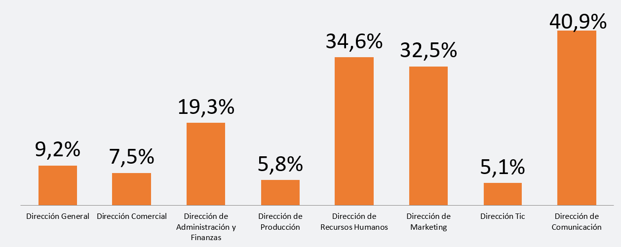 Considerando la presencia por tipologías de dirección, el estudio revela que solo un 9,2% de las mujeres en España logran acceder a puestos de dirección general, una cifra que refleja la persistente falta de presencia femenina en los niveles más altos de liderazgo empresarial. Sin embargo, en algunas áreas específicas, la presencia femenina es notablemente mayor. Es el caso de la dirección de comunicación, donde las mujeres ocupan el 40,9% de los cargos, seguida de la dirección de recursos humanos (34,6%) y la dirección de marketing (32,5%). En contraste, posiciones directivas tradicionalmente masculinas, como la dirección de producción (5,8%) y la dirección TIC (5,1%), siguen presentando una marcada disparidad de género.