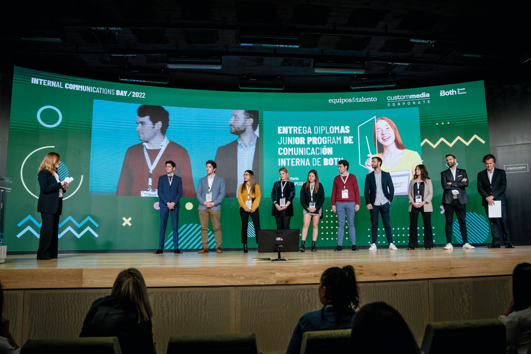 Antes de finalizar el evento, Gemma Martín, directora de la Oficina de Madrid de Both People& Comms, y Eduardo Menal, partner & Executive director de la firma, entregaron los Diplomas Junior Program CI, reconociendo así el talento junior en la función de comunicación interna. En este momento, Martín afirmó: “Iniciamos la andadura del Junior Program CI de Both People&Comms que está destinado a los futuros líderes de la comunicación interna. Esta mañana, hemos estado hablando de cambio y de transformación cultural y, para hacer más fácil este cambio, desde de Both People&Comms decidimos apoyar, mentorizar y acompañar a una selección de jóvenes talentos menores de 30 años de las áreas de RRHH y de Comunicación”.