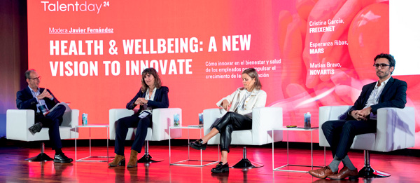 Esperanza Ribas HR director South Europe de Mars, expuso que: “Los managers son nuestro primer canal, y trabajamos en intentar concienciar, en hablar de temas de salud. Nuestros asociados son los que se encargan de poner en marcha las iniciativas. Contamos con beneficios flexibles ya adaptados y destacaría que nuestras oficinas son lugares seguros y que ayudan al bienestar porque son petfriendly, y quienes tenemos mascotas sabemos el gran beneficio que aporta tenerlas cerca”. Por su parte, Matías Bravo, Country P&O director de Novartis, aseguró que: “Para mí, el wellbeing es complejo, requiere un enfoque 360. Nosotros nos enfocamos en reducir las fuentes que generan la ansiedad y el malestar, usando nuestras encuestas de clima y haciendo upskilling de nuestros managers para que sepan tratar estos temas”. Javier Fernández, Executive director de Human Capital & Health Solutions en Cataluña y Baleares de Aon, moderó la mesa.