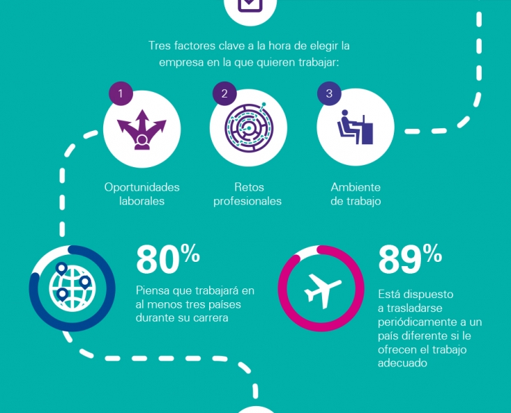 No obstante, una gran mayoría de los estudiantes (el 89%) apuesta por la movilidad internacional y asegura estar dispuesto a trasladarse periódicamente a un país diferente si se presenta la oportunidad laboral adecuada. De hecho, ocho de cada diez encuestados esperan trabajar al menos en tres países diferentes a lo largo de su carrera profesional.