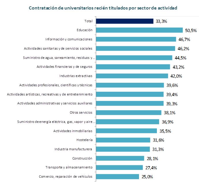 Del total de más de 2.000 empresas analizadas, el 33,3% contrató a algún recién titulado. Los sectores que mayor número de contrataciones efectuaron fueron Educación (el 50,5% de las empresas encuestadas llevó a cabo alguna contratación de recién titulados), Información y Comunicaciones (46,7%) y Actividades Sanitarias y Servicios Sociales (46,2%).