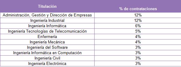 Los datos obtenidos muestran que dos titulaciones han protagonizado prácticamente una de cada cuatro contrataciones. Se trata de Administración, Gestión y Dirección de Empresas (12%) e Ingeniería Industrial (12%). Cerca de la mitad de las contrataciones proceden de 10 titulaciones.