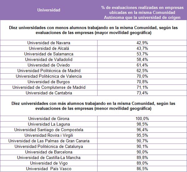 En la misma línea que el año pasado, la escasa movilidad geográfica de los egresados supone que el 70% de las valoraciones hagan referencia a alumnos de universidades de la misma Comunidad Autónoma en la que radica la empresa, es decir 7 de cada 10 titulados españoles trabajan en la Comunidad Autónoma donde estudiaron. En este sentido, destaca la Universidad de Girona, con el 100% de los licenciados trabajando en empresas radicadas en Cataluña. Únicamente 6 centros han conseguido situarse por debajo de la media, la Universidad de Navarra, la de Alcalá de Henares, Salamanca, Valladolid, Oviedo y la Politécnica de Madrid.