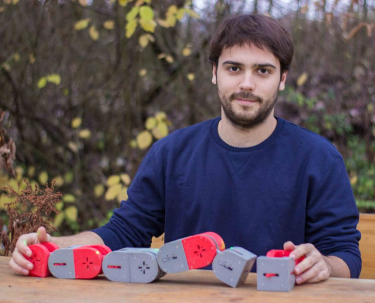 Dtto es un robot modular y se ha convertido en la evolución de su trabajo de fin de grado. Está construido con piezas realizadas con una impresora 3D, servomotores y microcontroladores. Los módulos del robot se pueden unir o separar entre ellos formando diferentes orientaciones y, de este modo, se adapta a cualquier terreno.