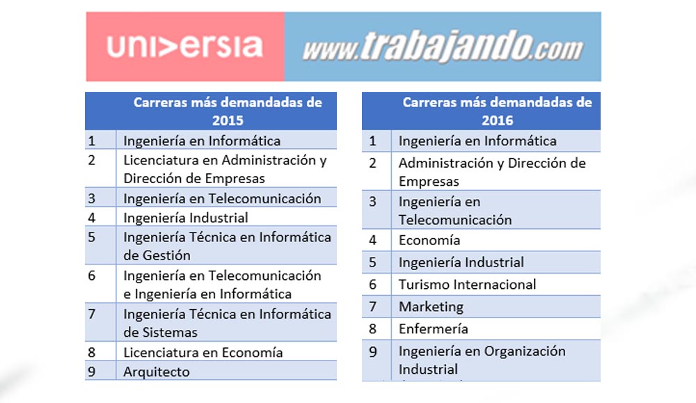 25/01/2017 · La Comunidad Laboral Trabajando.com – Universia ha realizado un análisis entre las más de 100.000 ofertas de empleo publicadas por sus empresas clientes durante el pasado año para conocer cuáles son los perfiles que más necesitan las organizaciones. Por cuarto año consecutivo, la titulación en Ingeniería Informática ocupa el primer lugar aunque, como en esta nueva edición, Arquitectura cede su 9º puesto a Enfermería que ha entrado en el ranking junto con Turismo y Marketing.