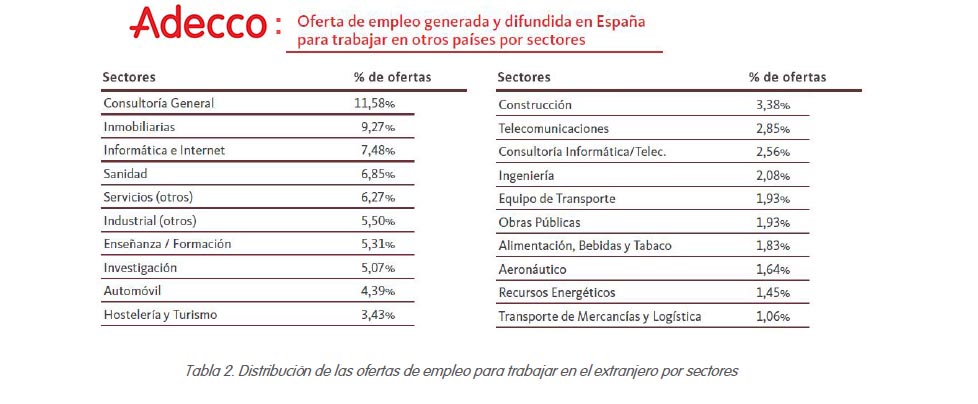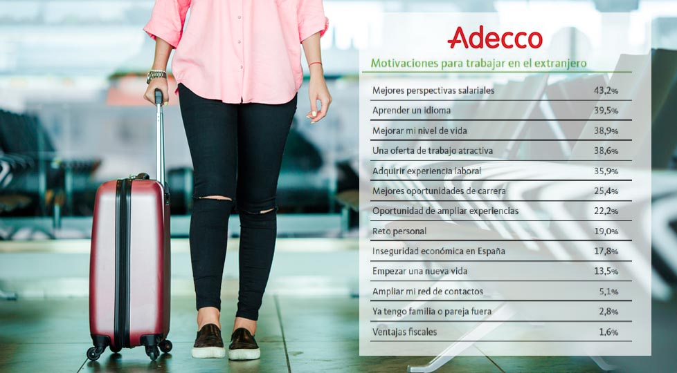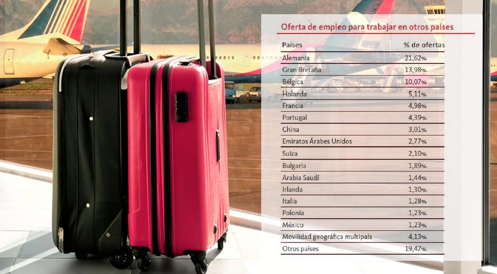 09/02/2017 · El último informe sobre "Empleo en el extranjero y Movilidad Internacional" de Adecco revela que en el último año, ha subido el número de ofertas de trabajo publicadas en España para trabajar en el extranjero en un 6,3% con respecto al pasado año. El informe revela, además, que la demanda de profesionales españoles en el extranjero se dirige fundamentalmente a aquellos con titulación universitaria en el 68,6% de los casos frente al 31,4% que está enfocado a profesionales con titulación de FP media o superior, de máster, bachillerato o a aquellos que tienen el graduado o la ESO.