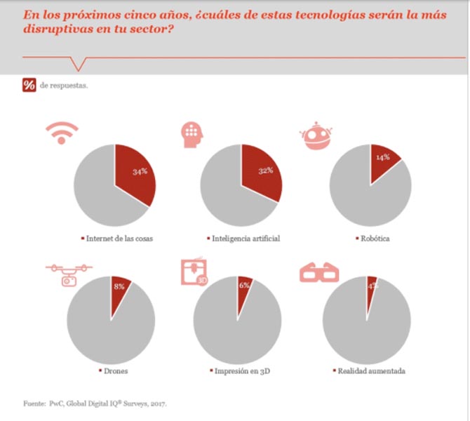 Además, a esta circunstancia se une la rápida y continúa proliferación de las nuevas tecnologías digitales donde despuntan las inversiones, para los próximos cinco años, en el Internet de la Cosas, la Inteligencia Artificial y la robotización. Muy por delante de la impresión en 3D, de la realidad aumentada o de los drones.