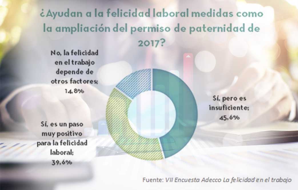 Consultados sobre una de las últimas medidas del Gobierno en favor de la conciliación, como ha sido la reciente aprobación de la ampliación del permiso de paternidad a 4 semanas, y si éstas ayudan a aumentar la felicidad de los trabajadores. Un 45,6% opina que sí ayuda, aunque, una vez más son las mujeres, las personas más jóvenes y los encuestados con formación universitaria quienes ven esta medida como positiva pero insuficiente.