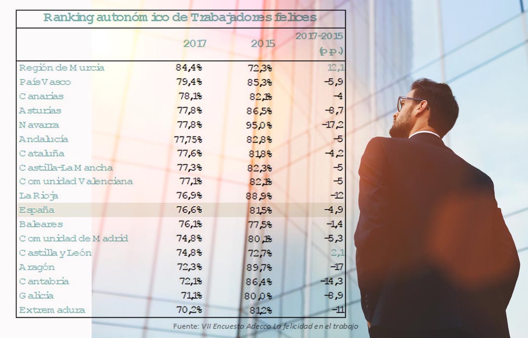 Por último, por regiones, son los murcianos, vascos y canarios quienes afirman ser los trabajadores más felices, En el extremo opuesto, Cantabria, Galicia y Extremadura aunque todos ellos se encuentran por encima de la media española.