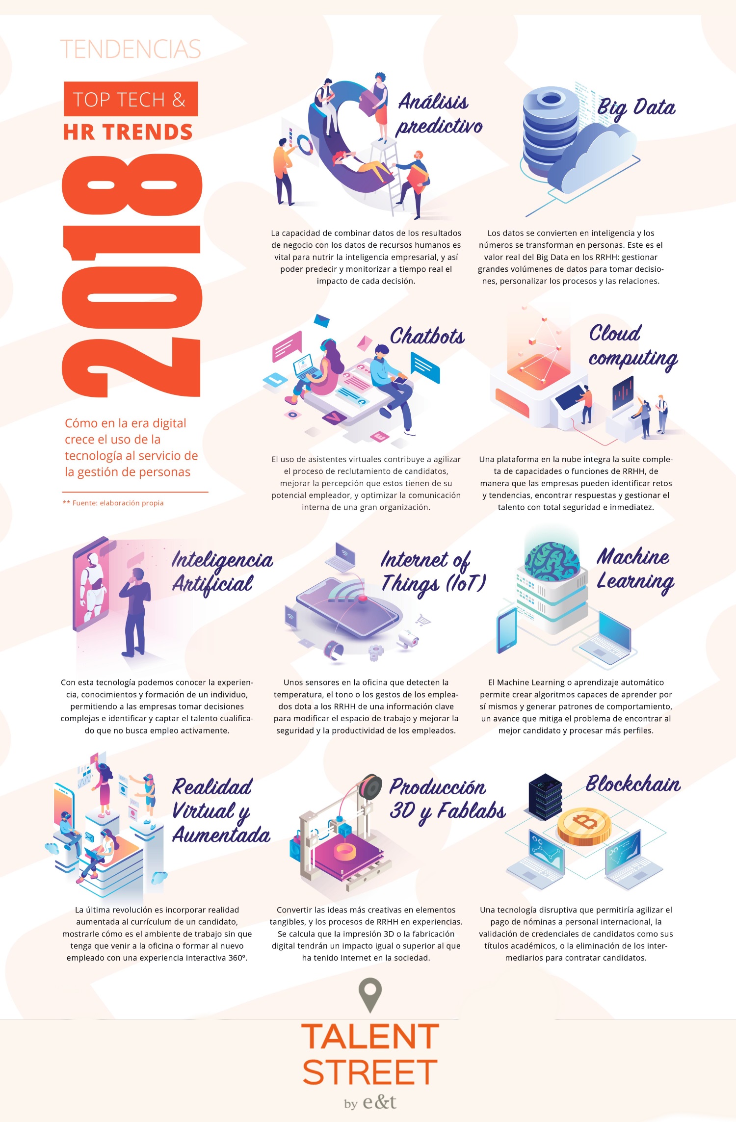 La era digital es imparable y el futuro del empleo se dirige cada vez más a espacios de trabajo donde la colaboración máquina-hombre parece ser el camino a seguir. Así lo desvelan los expertos en la gestión de personas, quienes ya avanzan las implicaciones, ventajas y retos que traerá el desarrollo e implementación de las nuevas tecnologías en las organizaciones. En este sentido, desde Talent Street hemos resumido cuáles son esas 10 tendencias tecnológicas emergentes, que están permitiendo transformar el área de recursos humanos.
