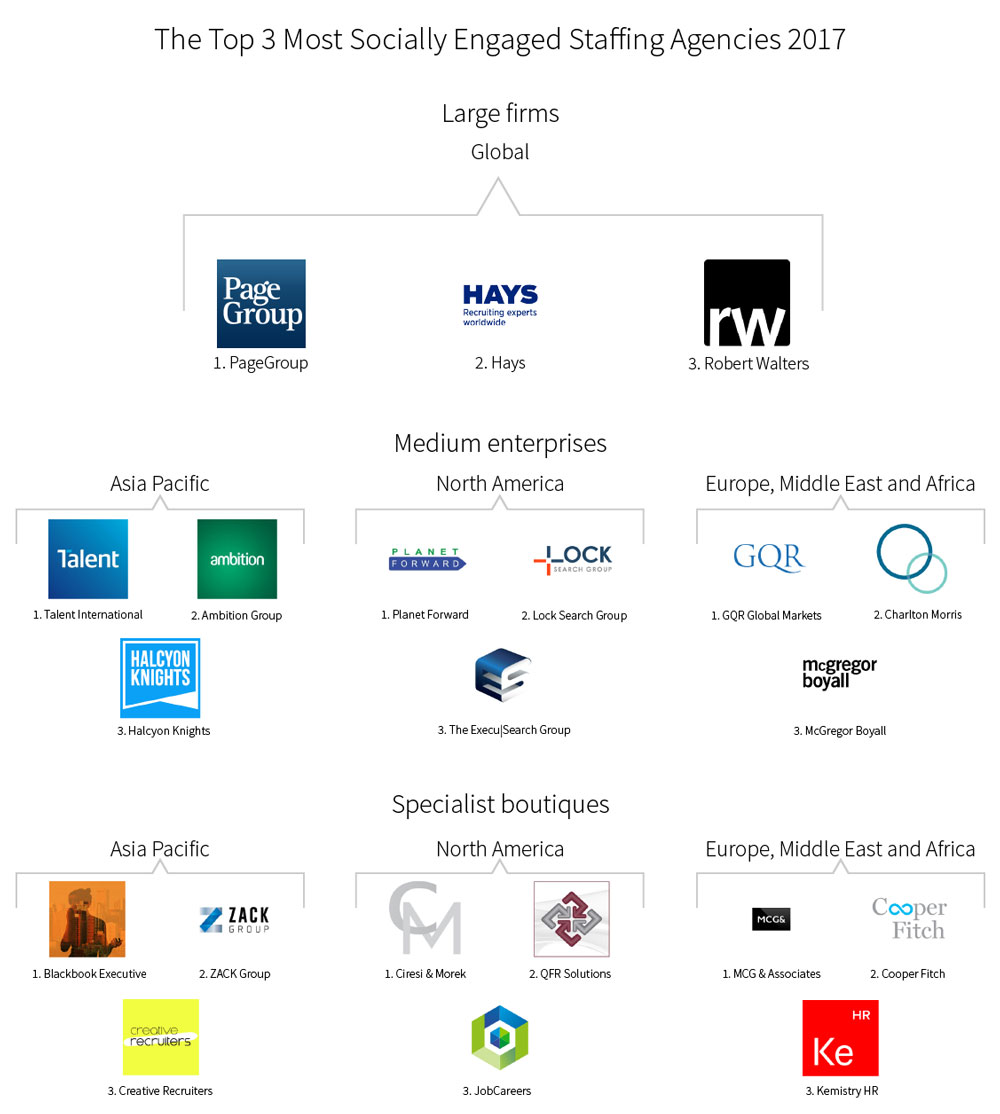 Este año, LinkedIn ha incluido en su análisis a más de 60.000 organizaciones de búsqueda y de personal. De entre ellas, ha nombrado a las tres agencias más comprometidas socialmente de 2017, en cada una de las tres categorías con las que cuenta el ranking en función de su tamaño y, por primera vez, por su localización. De esta forma, la lista distingue entre aquellas que tienen la sede ubicada en Asia Pacífico, Norte America y la región EMEA (Europa, Oriente Medio y África).