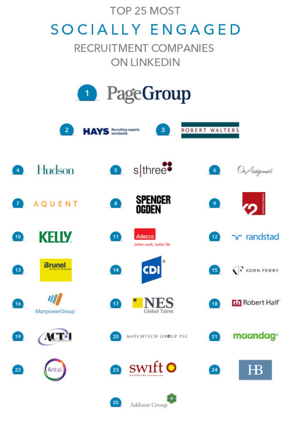 Por primera vez, LinkedIn ha revelado cuáles son las 25 agencias de reclutamiento más comprometidas socialmente del mundo, a partir del estudio de una serie de métricas que incluyen el alcance social, el compromiso e interacción de los empleados en la red social, la marca de talento y el poder de marketing de contenido en LinkedIn.