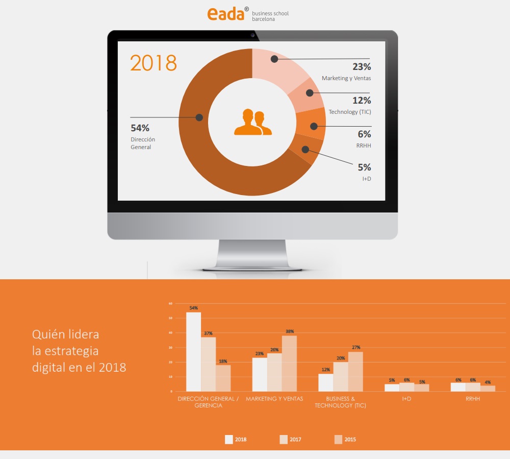 En este sentido, y en apenas tres años se ha producido un cambio considerable. Entonces, las compañías percibían que lo digital era, en buena medida, equivalente al marketing digital y era esta área funcional de la empresa la que lideraba la cuestión (38%) seguida de la de Business & Tecnology (TIC) con un 27%, con una visión fundamentada en aplicaciones y plataformas.