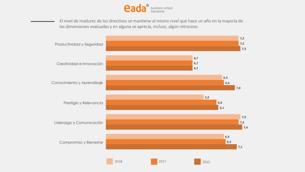 ¿Cuáles son las habilidades digitales de los directivos españoles en la actualidad? y, como consecuencia, ¿están preparados para liderar, la transformación digital de sus compañías? Estas son las dos preguntas principales a las que responde el estudio ‘Nivel digital directivo’, el cual cifra la madurez digital de dichos líderes, con un 5,9 sobre 10. La misma nota que ya obtuvieron los directivos en 2017, aunque los autores del estudio niegan que esto se deba a un estacamiento sino como una mayor conciencia digital. “Un baño de realidad que permite ser mucho más conscientes de la complejidad de la transformación”, según palabras de Ramón Costa, profesor de EADA Business School y director del informe.
