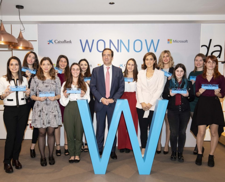 Gonzalo Gortázar, consejero delegado de CaixaBank, y Pilar López, presidenta de Microsoft España, han entregado los Premios WONNOW a 11 alumnas de carreras STEM -Ciencias, Tecnología, Ingeniería y Matemáticas- de universidades españolas. Con estos galardones, CaixaBank y Microsoft apuestan por el talento e impulsan la diversidad y la presencia de mujeres en el ámbito de la tecnología y las ciencias desde el inicio de su carrera profesional.