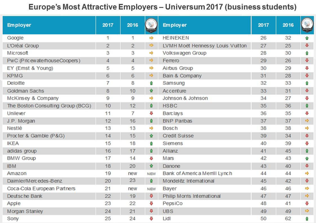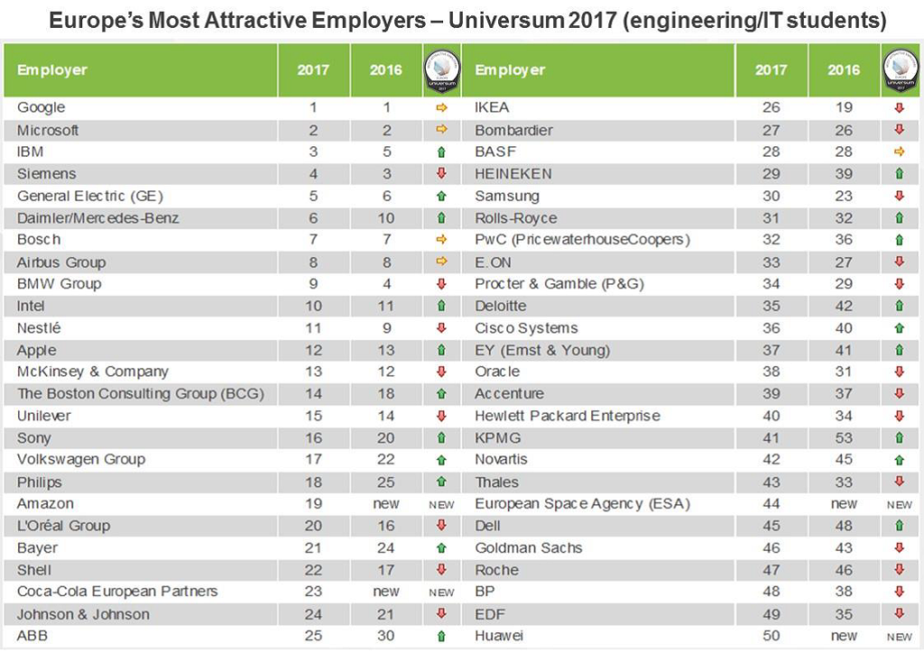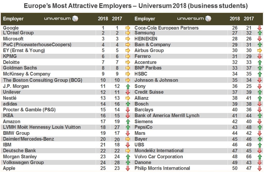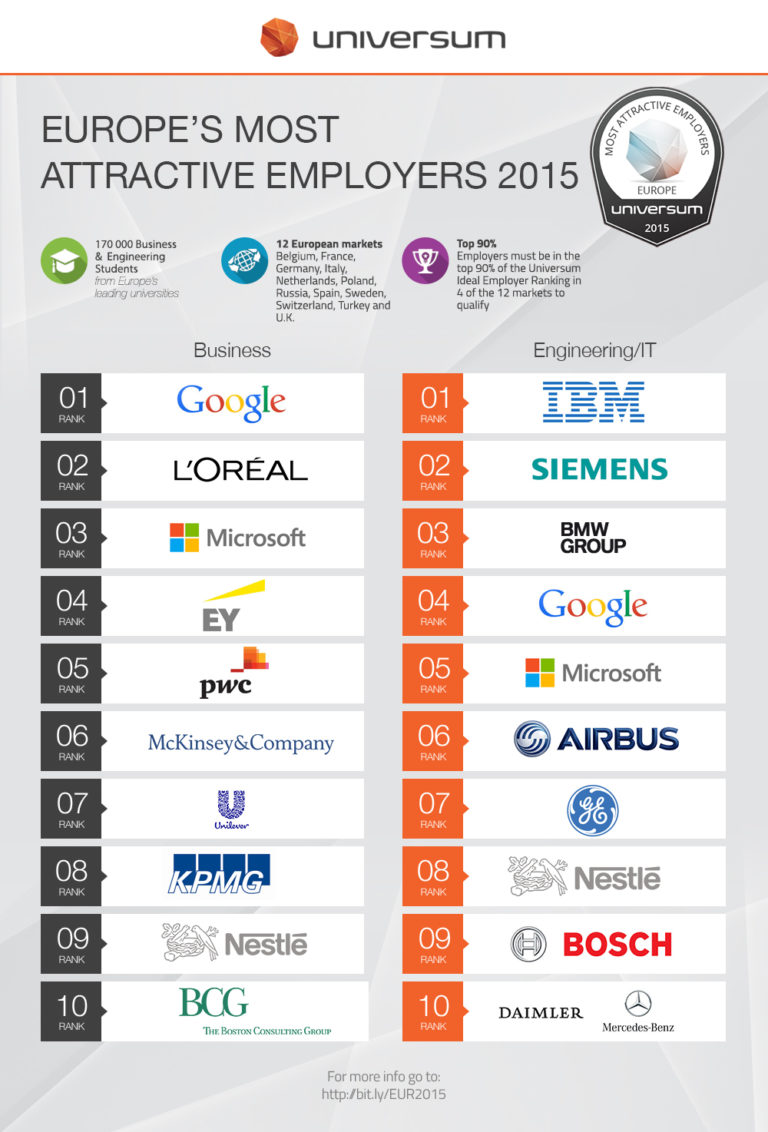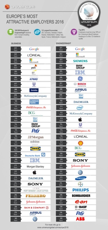 Más de 192.000 jóvenes de 12 países europeos han participado en la encuesta de Universum este año. De los resultados se deprende que Google es la empresa empleadora más atractiva de Europa, tanto para los estudiantes de ciencias empresariales como los de ingeniería / IT. También es destacada Microsoft que, aunque ocupa posiciones distintas en ambos rankings, se encuentra dentro del Top 3, el cual cierran L’Óreal en el caso de los estudiantes de ciencias empresariales y Siemens en el de los ingenieros.